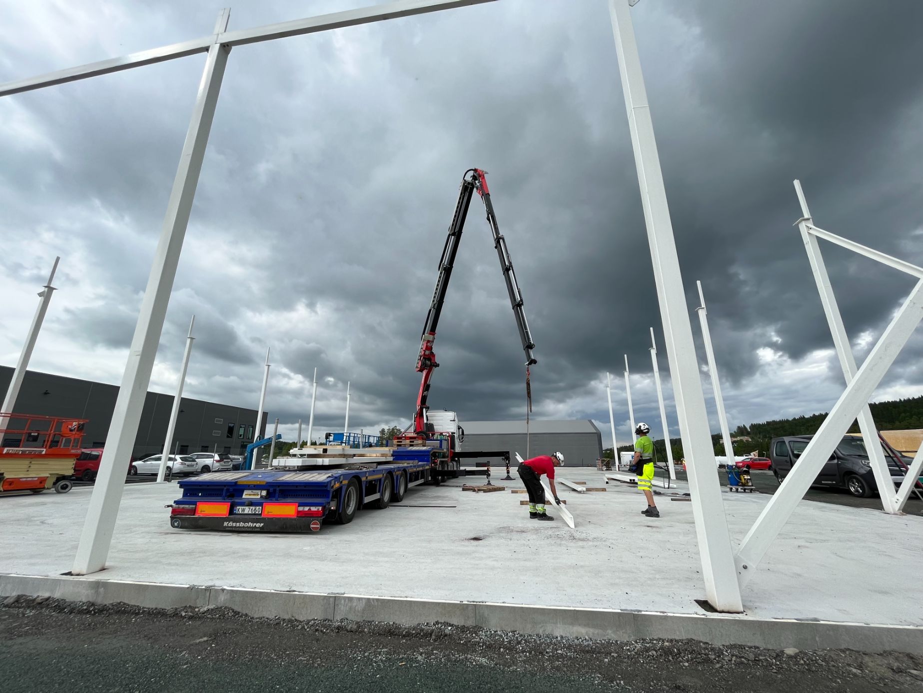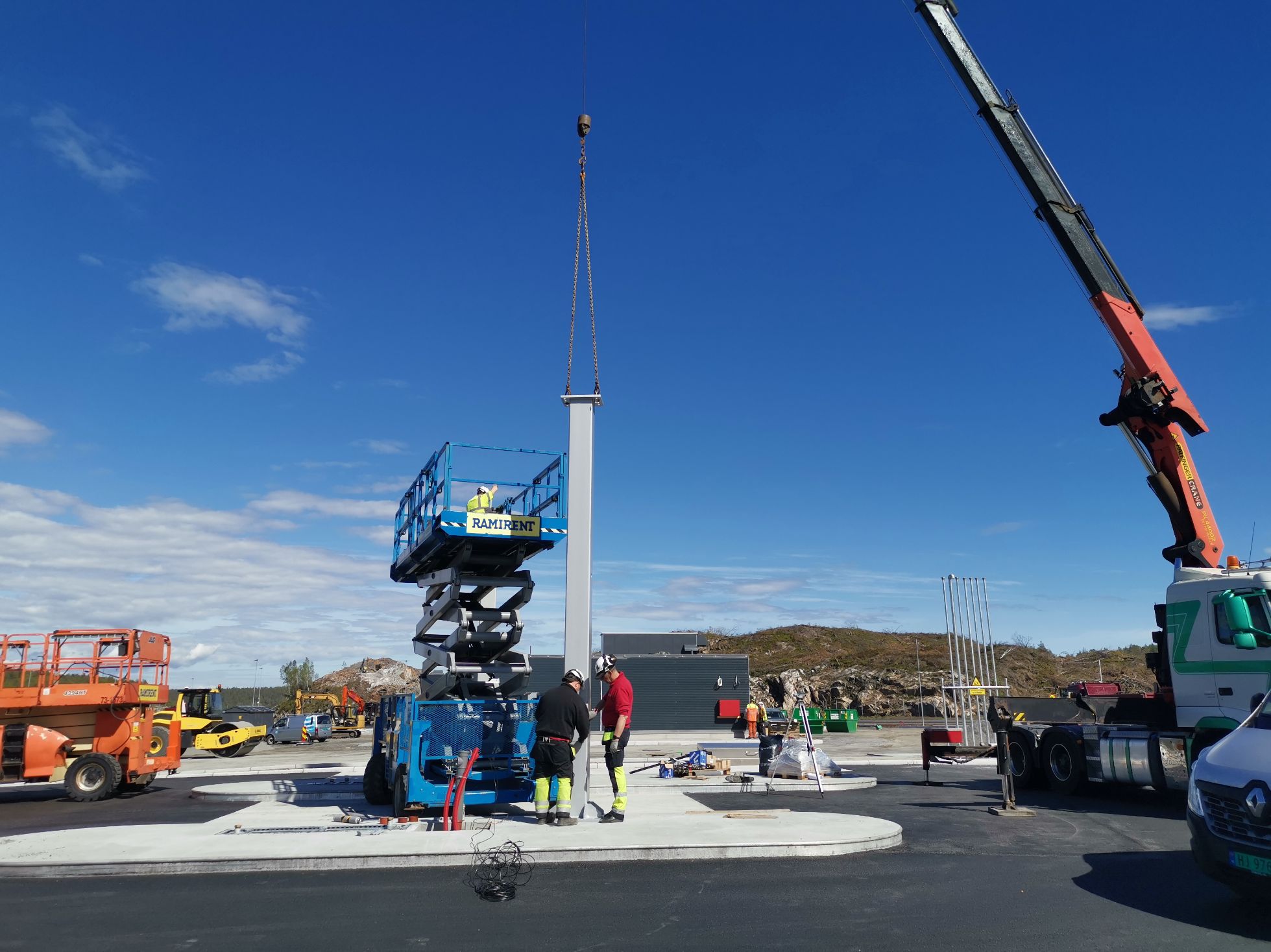 Vår kranbil med svanehenger og 72 tonn/meter + jibb med en rekkevidde på 32 meter, gjør det mulig for oss å løfte og montere konstruksjoner på en sikker måte. Vi har også mulighet til å kjøre kranen på strøm for å redusere støy og utslipp.